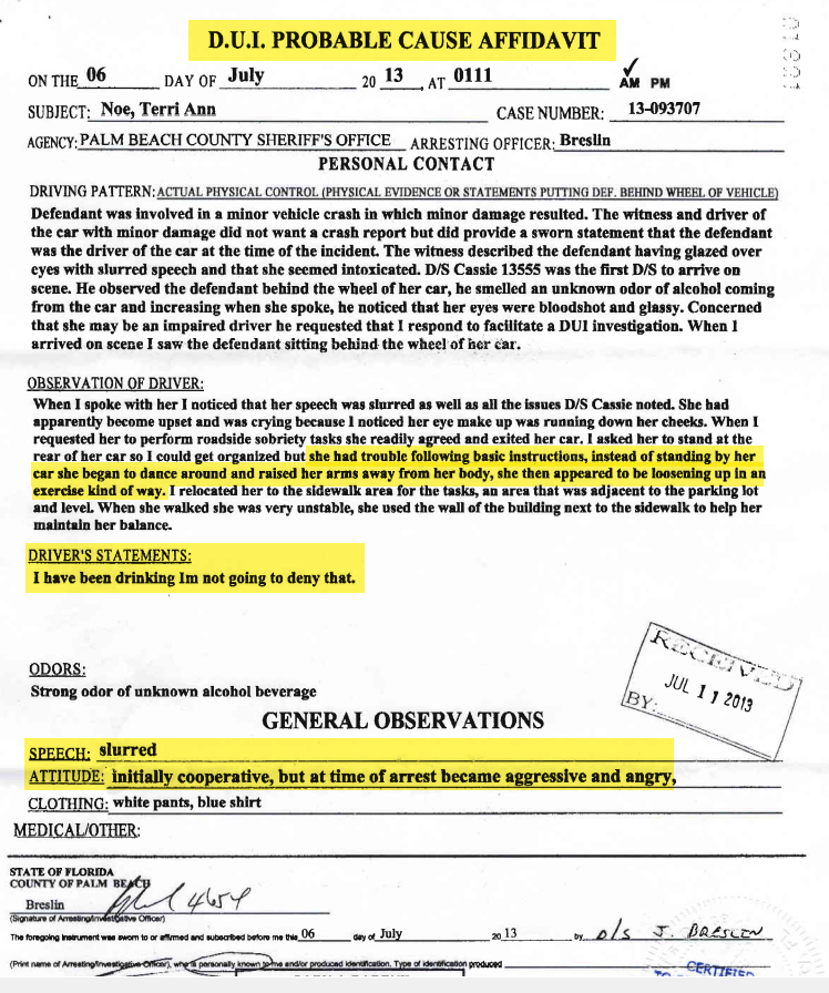 In the wee hours of one fateful Saturday morning, Terri Ann Noe was driving home after a night of excessive drinking and debauchery when she decided that it would be a good idea to drive home... Completely Sloppy Drunk INTOXICATED! She was then involved in an automobile accident at N. Military Trail and Okeechobee Blvd in Palm Beach County, FL. After refusing breathalyzer testing, the officer conducted a series of field sobriety tests.